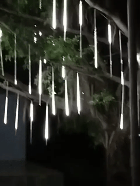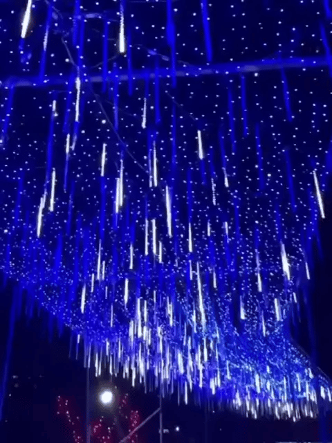 Cada bombilla LED se enciende y apaga en secuencia, generando un efecto de caída continua similar a una lluvia de meteoritos brillando en el cielo nocturno.