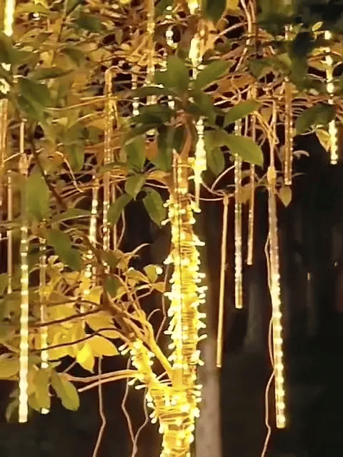 Cada bombilla LED se enciende y apaga en secuencia, generando un efecto de caída continua similar a una lluvia de meteoritos brillando en el cielo nocturno.